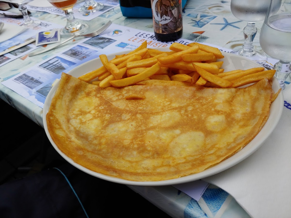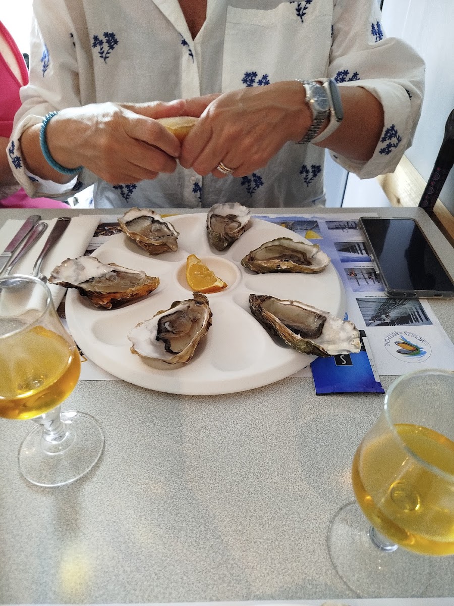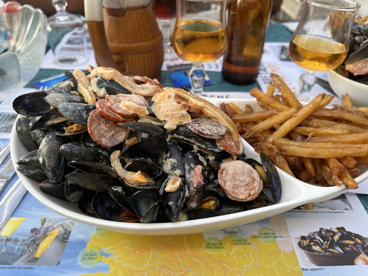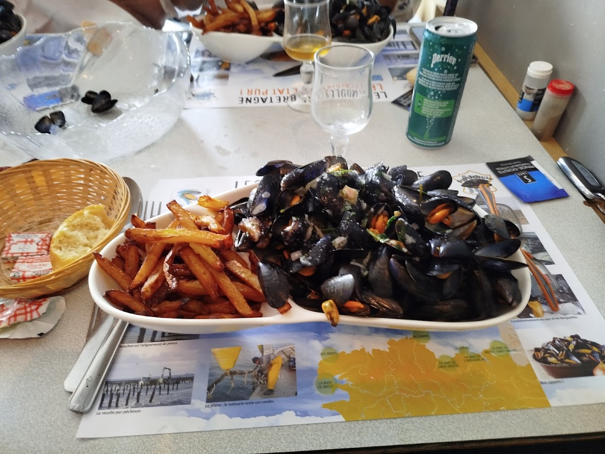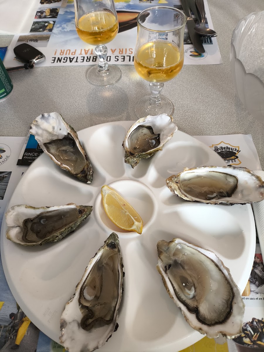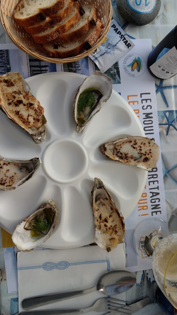 Trouvé par hasard belle surprise. Les huîtres sortent de l'eau, les moules fraîches avec des sauces a tomber. Une bière locale fameuse. Les ingrédients d'un très bon repas Breton. Merci beaucoup.